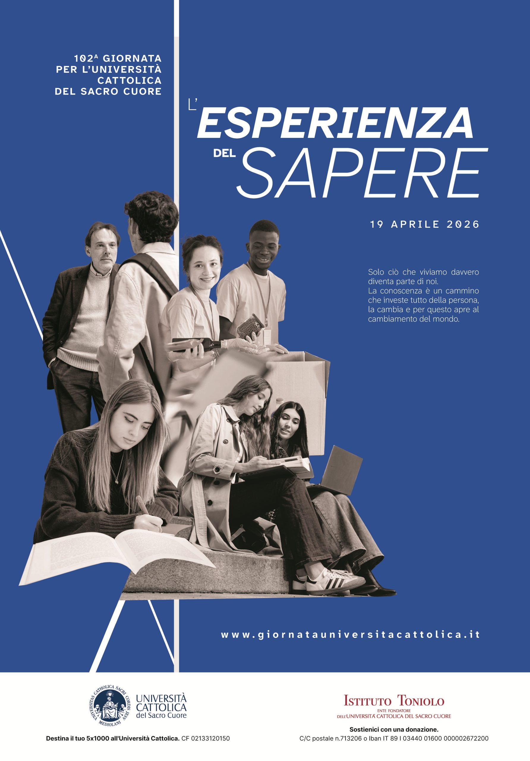 Domenica 19 aprile si celebra la 102ª Giornata per l’Università Cattolica del Sacro Cuore. Il tema di quest’anno, “L’esperienza del sapere”, invita a riscoprire la conoscenza come cammino che coinvolge tutta la persona. Solo ciò che viviamo davvero diventa parte della persona: il sapere non è semplice acquisizione di informazioni, ma esperienza che trasforma, apre al cambiamento e rende ciascuno protagonista nella costruzione del bene comune. Un’occasione per sostenere la missione educativa dell’Ateneo e riflettere sul valore di una formazione capace di unire competenza, responsabilità e crescita umana.
