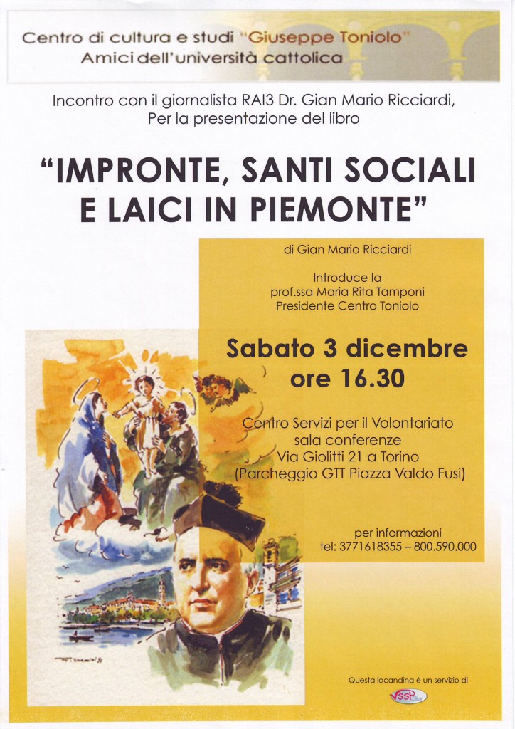 Sabato 3 dicembre 2011 ore 16.30 Il Centro di Cultura e Studi “Giuseppe Toniolo” – Amici dell’Università Cattolica di Torino organizza un incontro di presentazione del libro: “IMPRONTE, SANTI SOCIALI E LAICI IN PIEMONTE” di Gian Mario Ricciardi, giornalista RAI L’incontro si tiene presso il Centro Servizi per il Volontariato – sala conferenze Via Giolitti […]