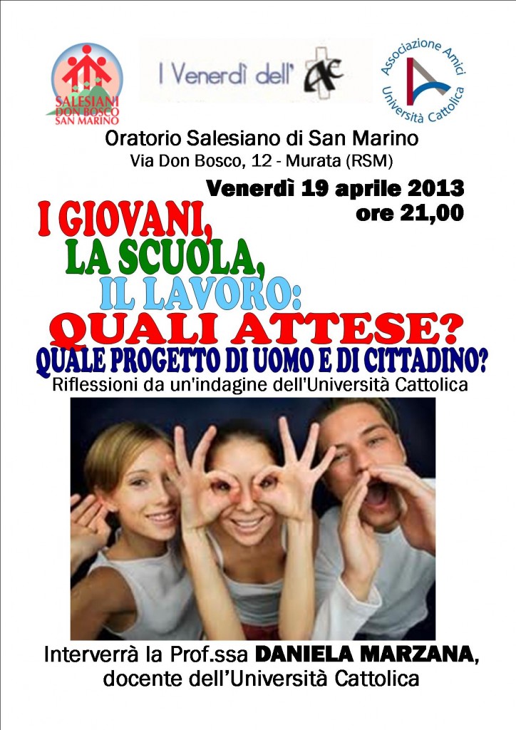 Venerdì 19 aprile 2013, alle ore 21.00, la prof.ssa Daniela Marzana dialogherà sul tema: “I giovani, la scuola, il lavoro: quali attese? quale progetto di uomo e di cittadino?”, approfondendo l’indagine promossa dall’Istituto Toniolo sui giovani. L’iniziativa è organizzata dalla Delegazione Diocesana dell’Università Cattolica in collaborazione con i Salesiani di San Marino, l’Azione Cattolica e […]