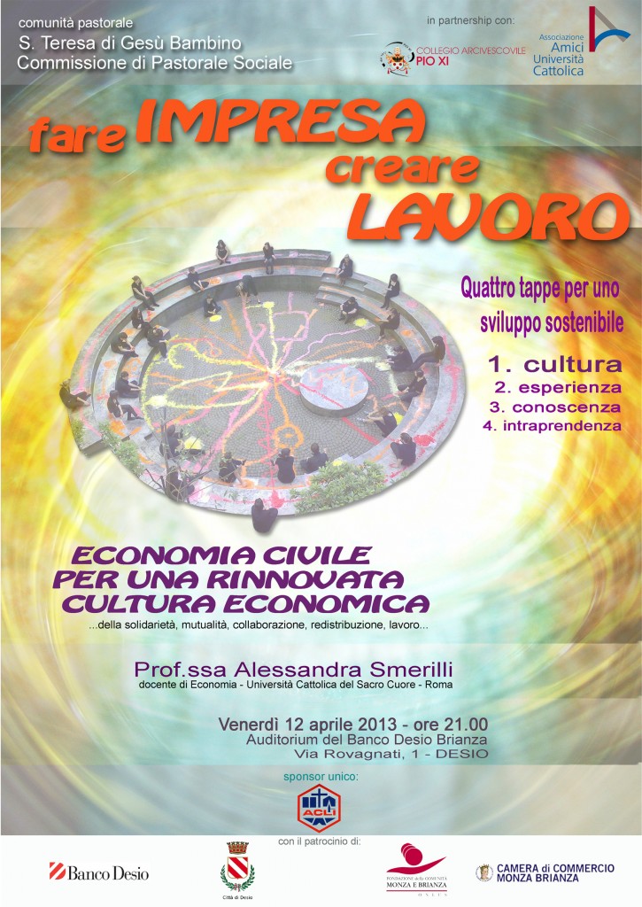 La Commissione di Pastorale Sociale della comunità Santa Teresa di Gesù Bambino a Desio propone quattro incontri sul tema “Fare impresa, creare lavoro”, in collaborazione con il Collegio Arcivescovile Pio XI e l’Associazione Amici dell’Università Cattolica: 1) venerdì 12 aprile 2013: Economia civile per una rinnovata cultura economica, con Alessandra Smerilli dell’Università Cattolica di Roma […]