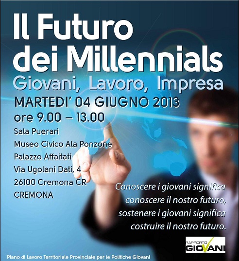 “Conoscere i giovani significa conoscere il nostro futuro, sostenere i giovani significa costruire il nostro futuro”. Questo il tema del convegno “Il futuro dei Millennials. Giovani, lavoro, impresa” che si terrà martedì 4 giugno a Cremona. Tra gli enti promotori anche l’Istituto Toniolo. Brochure