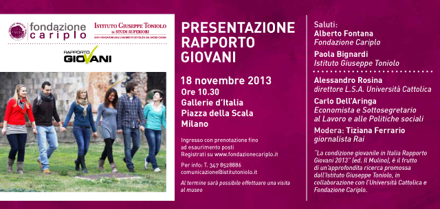 E’ stato presentato il 18 novembre, alle 10.30, alle Gallerie d’Italia in Piazza della Scala, il volume “La condizione giovanile in Italia- Rapporto Giovani 2013”. Sono intervenuti Alessandro Rosina (direttore L.S.A Università Cattolica) e Carlo Dell’Aringa (Economista e Sottosegretario al Lavoro e alle Politiche Sociali). Moderatrice, Tiziana Ferrario, giornalista Rai. Il volume è il primo rapporto pubblicato […]