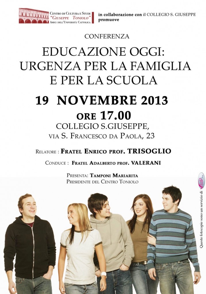 Martedì 19 novembre 2013 alle ore 17.00 presso il Collegio San Giuseppe di Torino è in calendario la conferenza “Educazione oggi: urgenza per la famiglia e per la scuola”, a cura del Centro di Cultura e Studi Giuseppe Toniolo – Amici dell’Università Cattolica di Torino, in collaborazione con il Collegio San Giuseppe. Dopo la presentazione […]