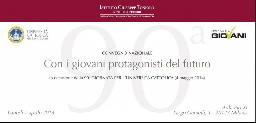 “Con i giovani protagonisti del futuro” è il tema della Giornata per l’ Università Cattolica (domenica 4 maggio 2014), giunta alla novantesima edizione. In occasione di questo evento, lunedì 7 aprile con inizio alle 9 e 30, nell’ Aula Pio XI della sede di Milano, si terrà il convegno nazionale. Questo il programma: Ore 9.30 […]