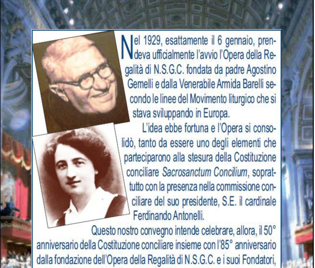 Dal 9 al 12 aprile 2015 a Milano è in calendario il Convegno liturgico-pastorale dell’Associazione Opera della Regalità di Nostro Signore Gesù Cristo, dedicato alla memoria di padre Agostino Gemelli e della Venerabile Armida Barelli. A 50 anni dalla Costituzione Sacrosanctum Concilium, in occasione dell’85° anniversario dalla fondazione dell’Opera della Regalità, il convegno porrà […]