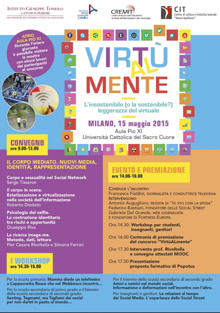 Si è concluso il concorso “VirtùALmente” e per tutti i partecipanti il 15 maggio in Università Cattolica a Milano ci sarà l’evento finale con la premiazione dei vincitori e laboratori interattivi. Per il numero numero elevato di partecipanti, l’evento previsto alle ore 14.00 è stato spostato dall’Aula Pio XI in AULA SANT’AGOSTINO. IL PROGRAMMA DELLA GIORNATA