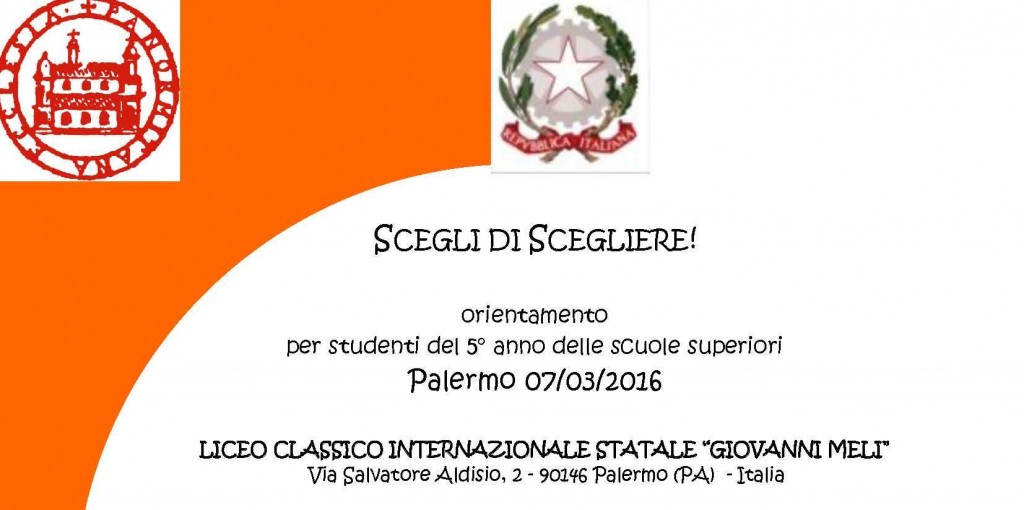 Lunedì 7 marzo 2016, presso il Liceo Classico internazionale “Giovanni Meli” di Palermo, gli studenti del quinto anno hanno in calendario un’intera mattinata per riflettere sull’università e sulle prospettive nel campo degli studi. Esperti dell’orientamento, psicologi, docenti affronteranno con i giovani il tema della scelta universitaria. Relatori: la prof.ssa Francesca Vella, preside, la […]