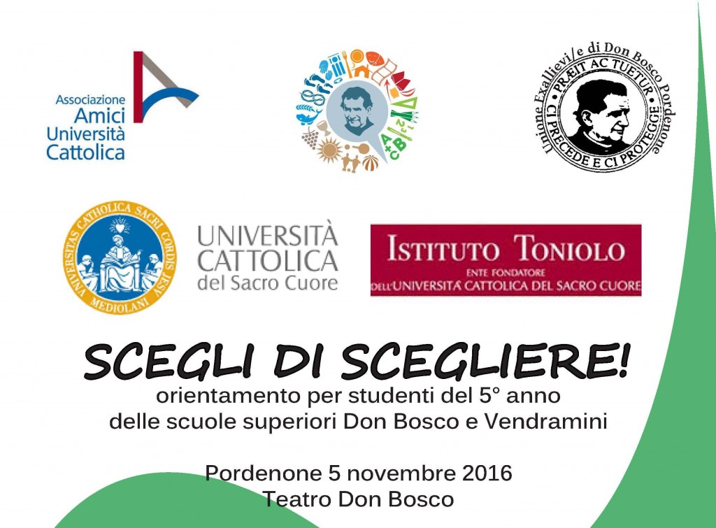 Sabato 5 novembre 2016 presso il Teatro Don Bosco a Pordenone è in calendario una giornata di orientamento per studenti del V anno delle scuole superiori. La scelta dell’Università Cattolica e l’accesso alle borse di studio saranno i temi illustrati da Loredana Oppizzio, del Servizio Orientamento dell’Ateneo del Sacro Cuore, e da Caterina Corradi, vincitrice […]