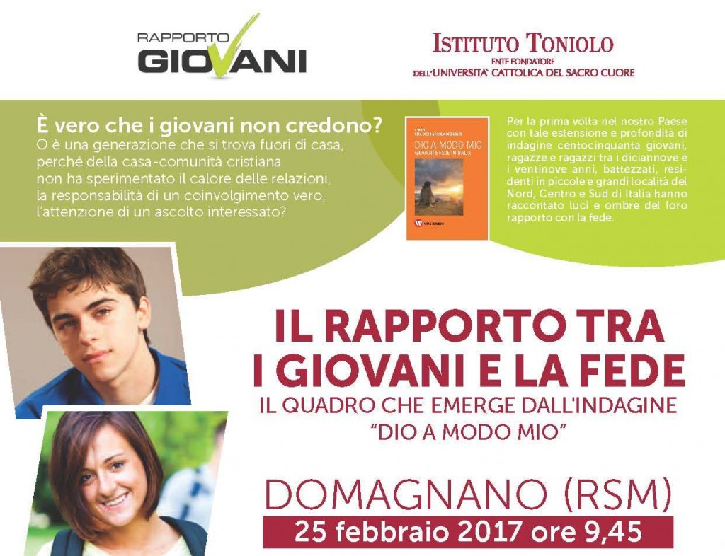 La diocesi di San Marino-Montefeltro si interroga sulla realtà giovanile locale, confrontandola con il quadro che emerge dall’indagine “Dio a modo mio. Giovani e fede in Italia”. All’introduzione di Emanuele Guidi, delegato diocesano dell’Università Cattolica, seguiranno la prolusione del Vescovo Mons. Andrea Turazzi e la relazione della prof. Rita Bichi, Ordinario di Sociologia generale presso […]