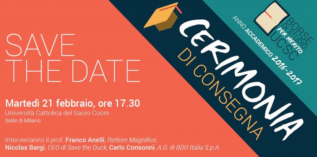 Università Cattolica e Istituto Toniolo assegnano martedì 21 febbraio a 100 iscritti e 100 neoimmatricolati 200 borse di studio di mille e 2mila euro. Alla cerimonia, insieme al rettore e a Paola Bignardi dell’Istituto Toniolo, interviene il Ceo di Save the Duck piumini, Nicolas BARGI, laureato dell’Ateneo. Leggi le testimonianze di alcuni studenti vincitori Scarica […]