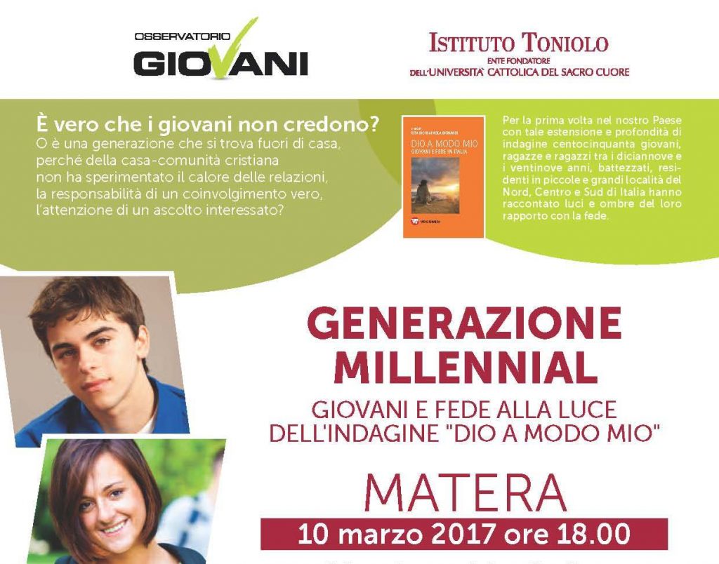 Venerdì 10 marzo 2017 alle ore 18.00 presso l’Istituto Sant’Anna di Matera la Pastorale Giovanile della diocesi si confronta con il Rapporto Giovani promosso dall’Istituto Toniolo. Anna Ferrara, Amica dell’Università Cattolica, introdurrà la prof. Elena Marta, Ordinario di Psicologia sociale e di comunità e tra gli autori dell’indagine. Concluderà mons. Antonio Giuseppe Caiazzo, Arcivescovo di […]
