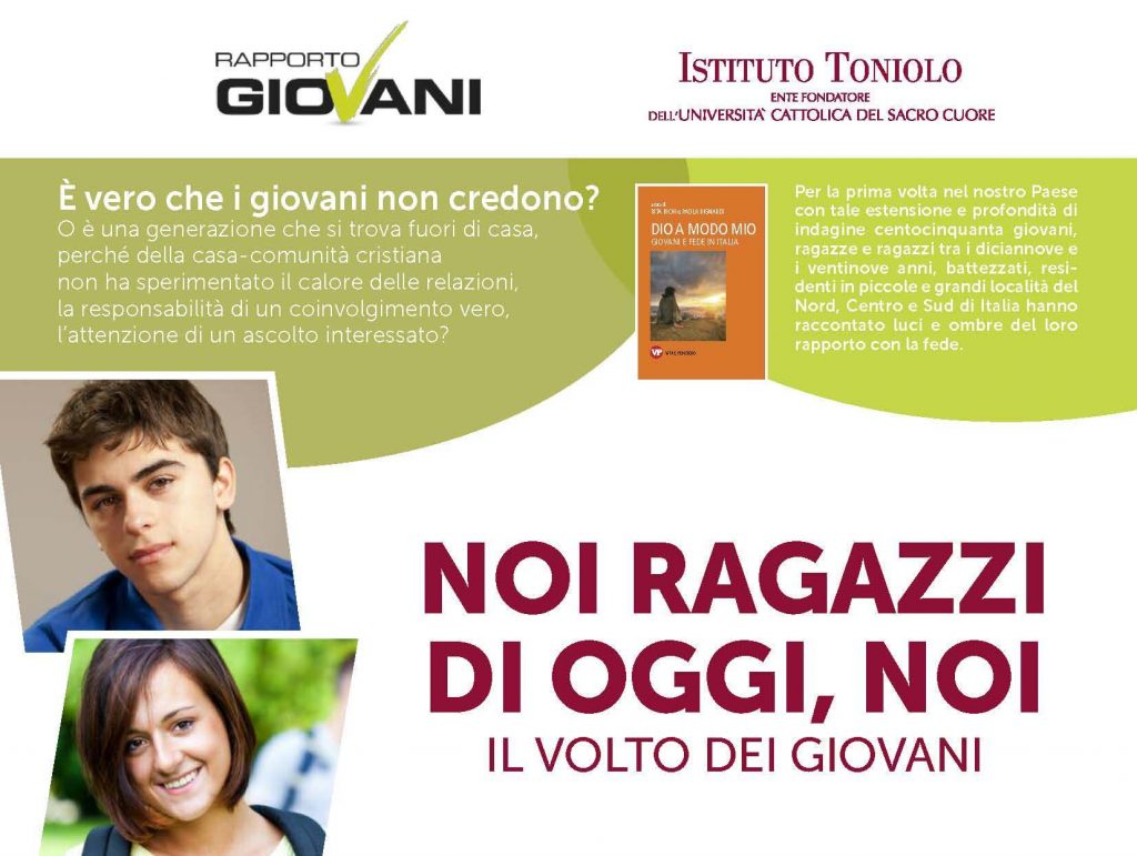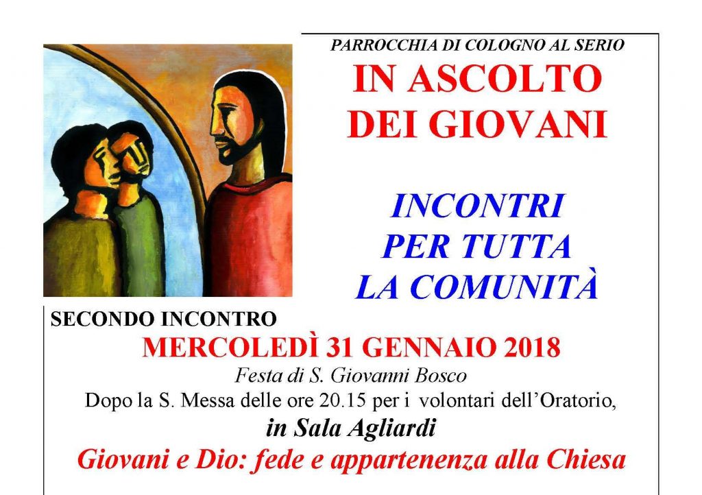 Mercoledì 31 gennaio 2018, in occasione della festa di San Giovanni Bosco, la prof. Rita Bichi ordinario di Sociologia generale all’Università Cattolica di Milano presenterà alcune riflessioni sui dati raccolti dall’Osservatorio Giovani dell’Istituto Toniolo, per un confronto all’interno della comunità in provincia di Bergamo. Alcuni giovani di Cologno al Serio racconteranno le loro situazioni di […]