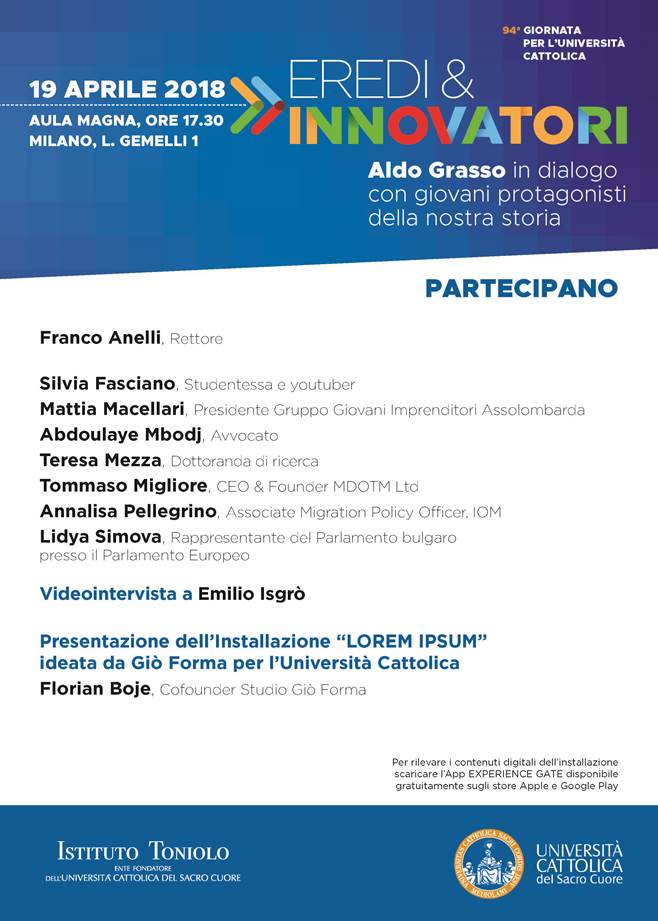 In occasione della 94ª Giornata per l’Università Cattolica, venerdì 19 aprile, alle ore 17.30 in Aula Magna (Largo A. Gemelli, 1, Milano), l’Università Cattolica e l’Istituto Toniolo organizzano l’evento “Eredi&Innovatori: Aldo Grasso in dialogo con i giovani protagonisti della storia“. Parteciperanno, oltre al professore e giornalista Aldo Grasso: Franco Anelli, Rettore dell’Università Cattolica Silvia Fasciano, Studentessa e youtuber […]