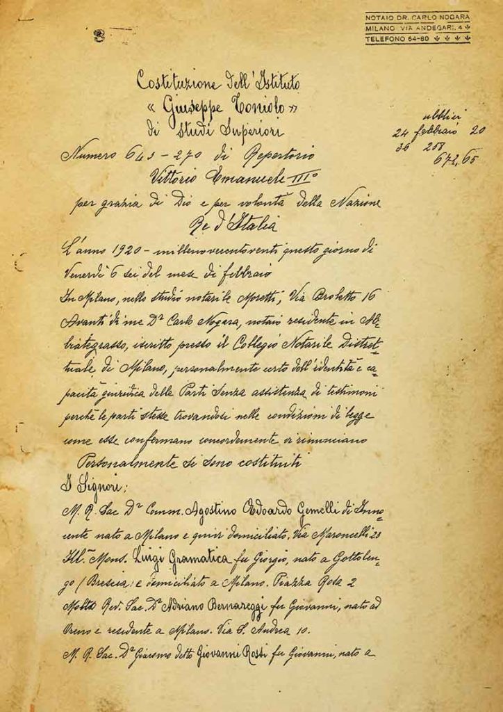 Cento anni fa, il 6 febbraio 1920, con atto pubblico redatto dal notaio Carlo Nogara, nasce l’Istituto Giuseppe Toniolo di Studi Superiori, eretto in Ente Morale il successivo 24 giugno. Padre Agostino Gemelli, alla cui tenace volontà più di tutte si deve la nascita dell’Università Cattolica del Sacro Cuore, insieme agli altri membri del comitato promotore, […]