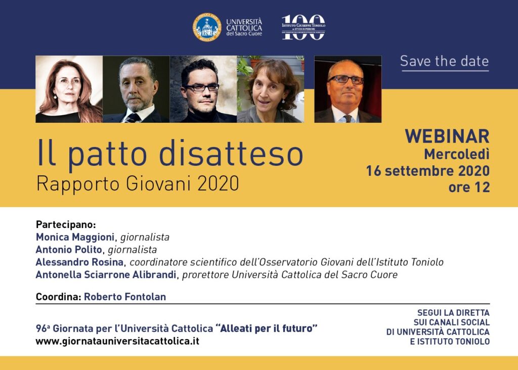 “Il Patto disatteso. Rapporto Giovani 2020” è il tema del webinar, organizzato dall’Istituto Giuseppe Toniolo e Università Cattolica del Sacro Cuore, mercoledì 16 settembre. Ospiti della diretta streaming Antonella Sciarrone Alibrandi, prorettore dell’ Università Cattolica del Sacro Cuore, Alessandro Rosina, coordinatore scientifico dell’Osservatorio Giovani dell’Istituto Toniolo, Monica Maggioni, giornalista, Antonio Polito, giornalista, con la moderazione di Roberto Fontolan. Durante il webinar, in diretta streaming sui […]