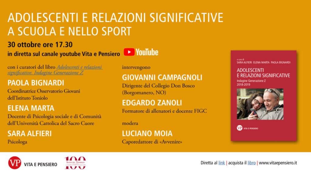 “Adolescenti e relazioni significative a scuola e nello sport” è il tema del webinar, organizzato da Vita e Pensiero e dall’Istituto Giuseppe Toniolo, venerdì 30 ottobre con inizio alle ore 17.30 Ospiti della diretta streaming i curatori del libro Paola Bignardi, coordinatrice dell’ Osservatorio Giovani dell’Istituto Toniolo, Elena Marta, docente di Psicologia Sociale e di Comunità dell’Università Cattolica del […]